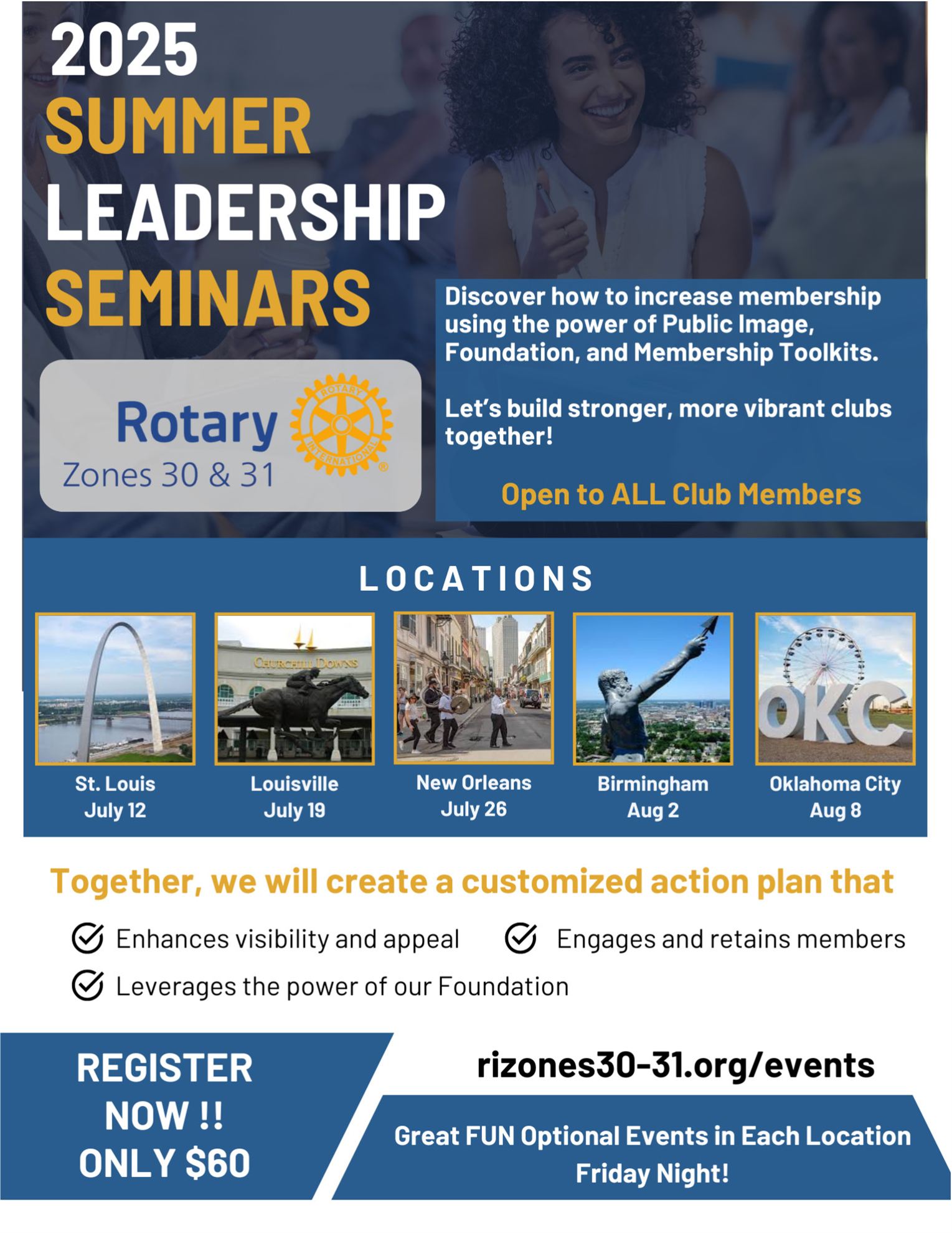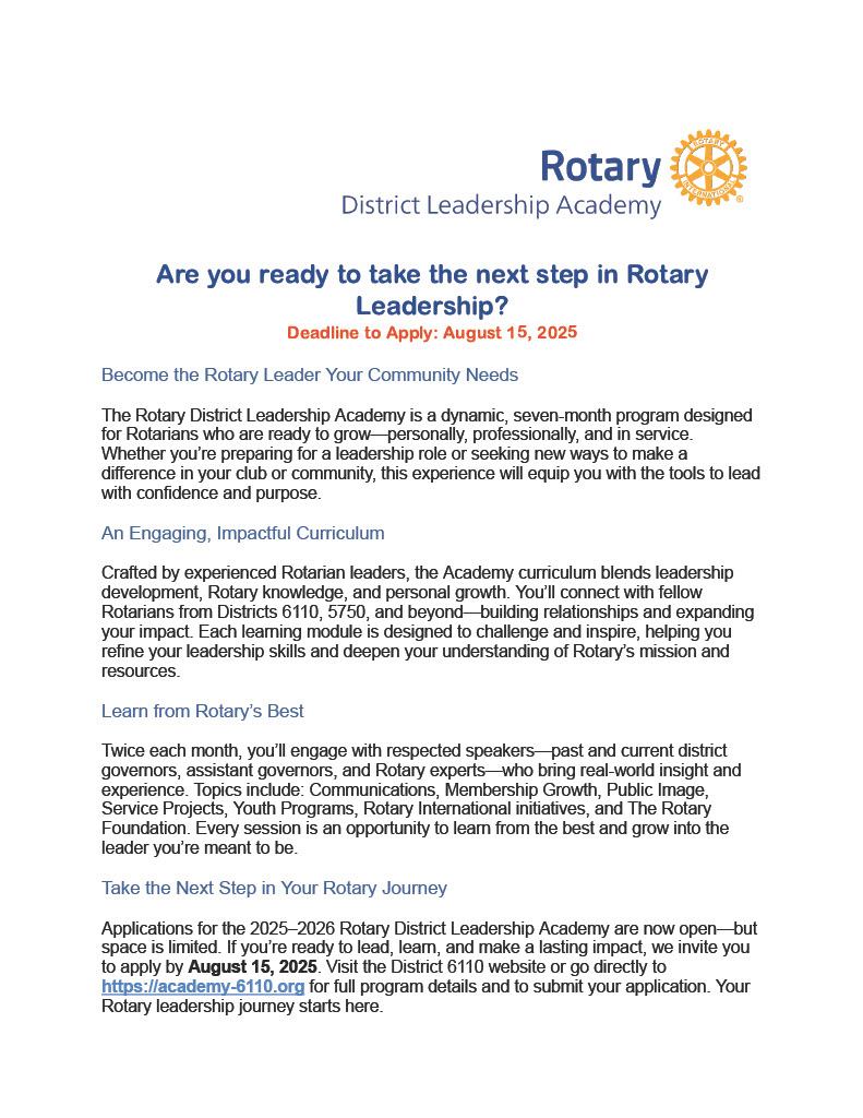 Are you ready to take your Rotary journey to the next level? The 2025 Rotary Summer Seminars are your opportunity to do just that—and more. With five exciting sessions offered across Zones 30 and 31, these seminars are your chance to connect, learn, and walk away with practical tools to grow membership, strengthen engagement, and deepen Rotary's impact in your community.