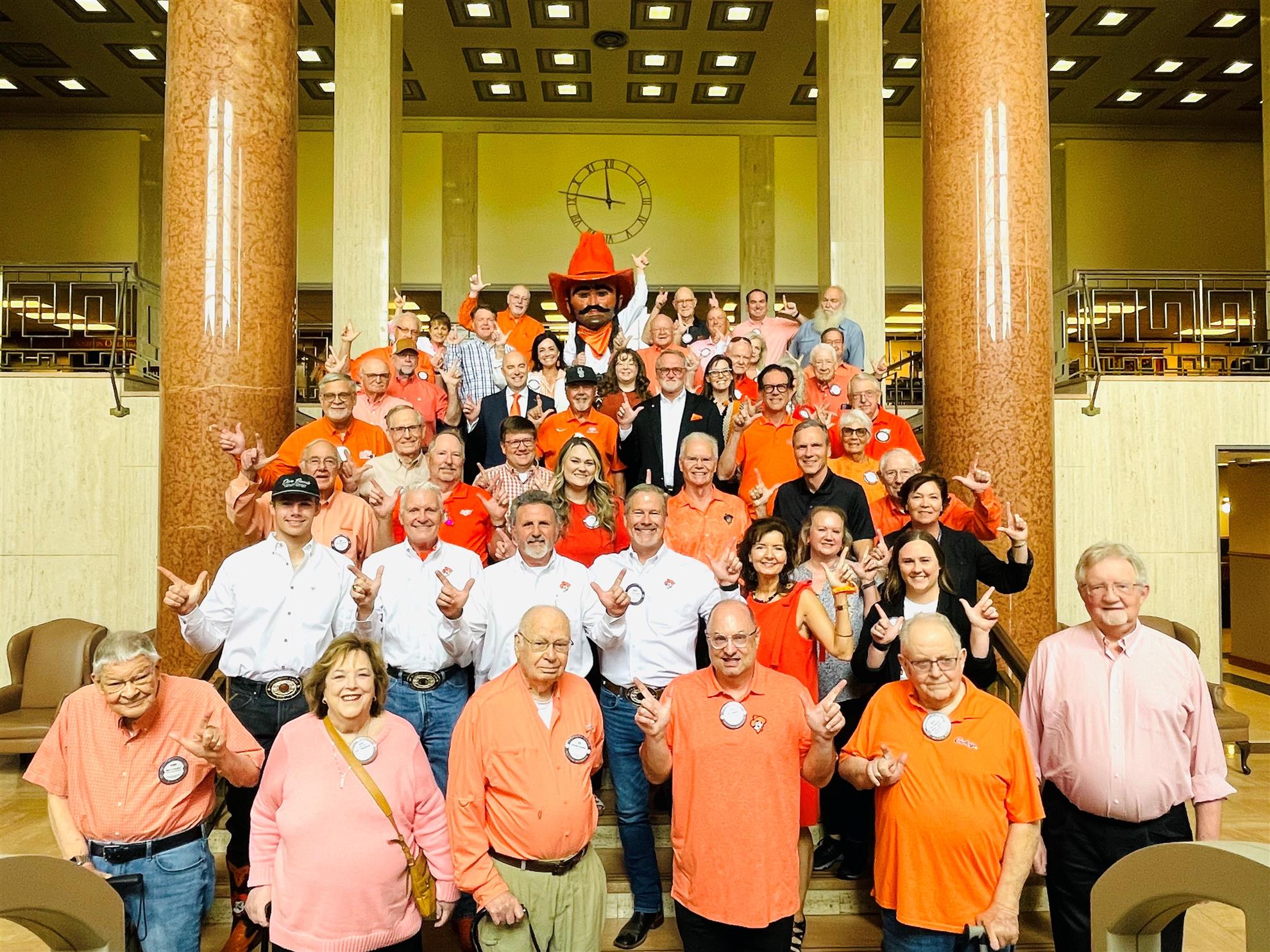 In late May, the Stillwater Frontier Rotary Club met in the beautiful OSU Edmon Low Library. Dressed in OSU spirit wear, club members took a group photo on the library’s elegant grand staircase. The first photo was pretty tame, but in the second photo, club members were “firing their pistols” in eager anticipation of a GREAT program on "100 Years of Pistol Pete"! In good cowboy style, the group feasted on a catered BBQ luncheon while enjoying a slide show of historic and really cool Pistol Pete photos.